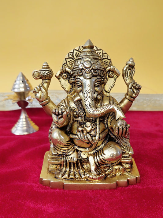 Divine Brass Lord Ganesha Idol Seated on Singhasan – Symbol of Wisdom & Prosperity