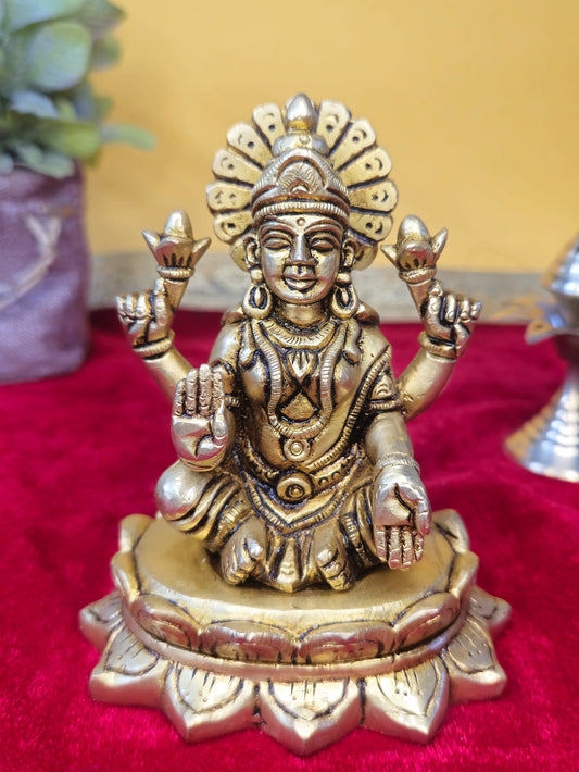 Divine Brass Goddess Lakshmi Idol Seated on Lotus – Symbol of Wealth & Prosperity